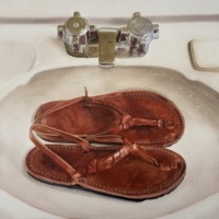 Nery Gabriel Lemus’ richly detailed watercolor paintings focus poetically on everyday symbols and the struggles of migration. In Camine Ese Camino, a pair of weathered sandals placed in a bathroom sink become the focal point, gesturing at the profound vulnerability of departing one’s birthplace and arriving at a new destination. The nature of home is redefined through the journey rather than the destination.